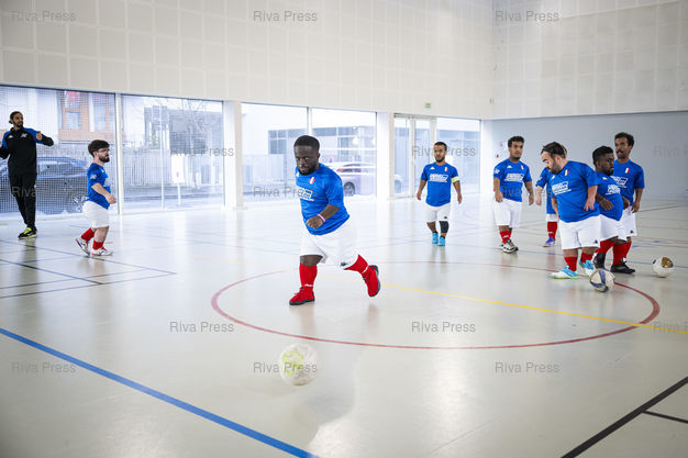 Légende : Le collectif France PPT (Personnes de Petite Taille) est rassemble a Asnieres-sur-Seine pour un weekend d'entrainement et de matchs amicaux. Ce samedi apres-midi, les joueurs venus de toute la France dans le but de preparer la Coupe du monde de football PPT qui se deroulera au Maroc en 2026, se preparent a affronter une equipe U11 et l'equipe senior futsal handisport de l'Academie Club Asnieres. Cree en 2022 a Asnieres-sur-Seine, l'objectif du collectif est d'offrir aux joueurs de petite taille un cadre structure, des competitions officielles et une reconnaissance sportive. Le 05/12/2025 /// The French PPT (People of Short Stature) collective is gathered in Asnières-sur-Seine for a weekend of training and friendly matches. This Saturday afternoon, players from all over France, preparing for the PPT Football World Cup to be held in Morocco in 2026, are getting ready to face an U11 team and the senior futsal team for disabled athletes from the Asnières Academy Club. Created in 2022 in Asnières-sur-Seine, the collective's objective is to offer players of short stature a structured environment, official competitions, and sporting recognition. On December 5, 2025 /// PHOTO Vincent Boisot