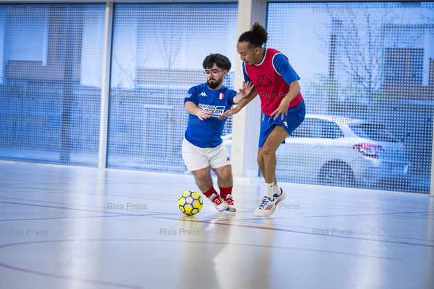 Légende : Le collectif France PPT (Personnes de Petite Taille) est rassemble a Asnieres-sur-Seine pour un weekend d'entrainement et de matchs amicaux. Ce samedi apres-midi, les joueurs venus de toute la France dans le but de preparer la Coupe du monde de football PPT qui se deroulera au Maroc en 2026, jouent contre l'equipe senior futsal handisport de l'Academie Club Asnieres. Cree en 2022 a Asnieres-sur-Seine, l'objectif du collectif est d'offrir aux joueurs de petite taille un cadre structure, des competitions officielles et une reconnaissance sportive. Le 05/12/2025 /// The French PPT (People of Short Stature) collective is gathered in Asnières-sur-Seine for a weekend of training and friendly matches. This Saturday afternoon, players from all over France, preparing for the PPT Football World Cup to be held in Morocco in 2026, are playing against the senior futsal team for disabled athletes from the Académie Club Asnières. Created in 2022 in Asnières-sur-Seine, the collective's objective is to offer players of short stature a structured environment, official competitions, and sporting recognition. On December 5, 2025 /// PHOTO Vincent Boisot