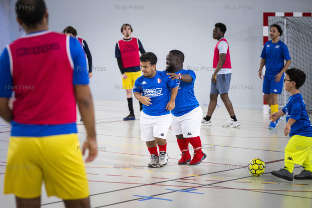 Légende : Le collectif France PPT (Personnes de Petite Taille) est rassemble a Asnieres-sur-Seine pour un weekend d'entrainement et de matchs amicaux. Ce samedi apres-midi, les joueurs venus de toute la France dans le but de preparer la Coupe du monde de football PPT qui se deroulera au Maroc en 2026, jouent contre l'equipe senior futsal handisport de l'Academie Club Asnieres. Cree en 2022 a Asnieres-sur-Seine, l'objectif du collectif est d'offrir aux joueurs de petite taille un cadre structure, des competitions officielles et une reconnaissance sportive. Le 05/12/2025 /// The French PPT (People of Short Stature) collective is gathered in Asnières-sur-Seine for a weekend of training and friendly matches. This Saturday afternoon, players from all over France, preparing for the PPT Football World Cup to be held in Morocco in 2026, are playing against the senior futsal team for disabled athletes from the Académie Club Asnières. Created in 2022 in Asnières-sur-Seine, the collective's objective is to offer players of short stature a structured environment, official competitions, and sporting recognition. On December 5, 2025 /// PHOTO Vincent Boisot
