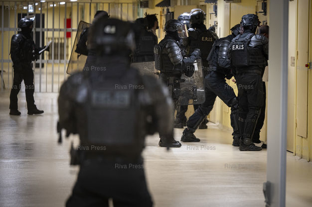 Légende : Dans le cadre de l'operation "Fouilles XXL", des detenus du quartier d'isolement de la maison d'arret pour hommes de Fleury-Merogis sont extraits de leur cellule par des ERIS (Equipes Regionales d'Intervention et de Securite de l'administration penitentiere). Ces operations sont menees dans tous les centres penitentiers de France a la demande du ministre de l'Intérieur Gerald Darmanin dans le but de lutter contre la presence de telephones portables en prison, mais aussi de stupefiants et de tout autre objet interdit. Le 10/12/2025 /// As part of Operation "XXL Searches," inmates in the isolation wing of the Fleury-Mérogis men's prison are being removed from their cells by ERIS (Regional Intervention and Security Teams of the prison administration). These operations are being carried out in all French prisons at the request of Interior Minister Gérald Darmanin in order to combat the presence of mobile phones in prisons, as well as narcotics and other prohibited items. On December 10, 2025 /// PHOTO Vincent Boisot