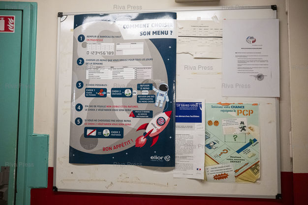 Légende : Panneau d'affichage dans un couloir de la maison d'arret pour hommes de Fleury-Merogis pendant la nuit, expliquant notamment le fonctionnement des repas. Le 10/12/2025 /// Notice board in a corridor of the Fleury-Merogis men's prison during the night, explaining in particular how meals work. On December 10, 2025 /// PHOTO Vincent Boisot