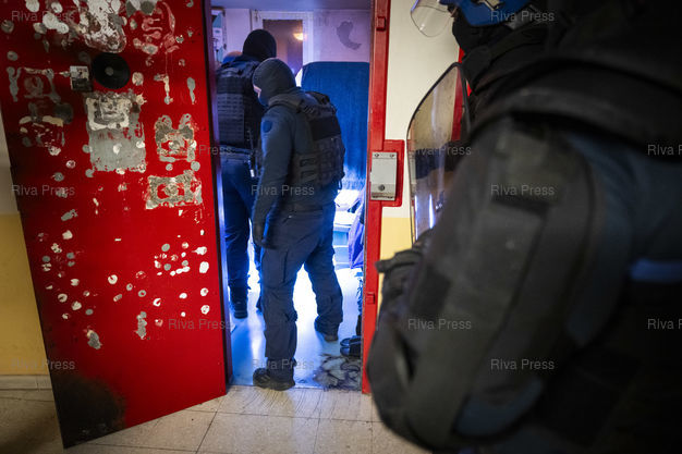Légende : Dans le cadre de l'operation "Fouilles XXL", des agents de l'administration penitentiere extraient des detenus de la maison d'arret pour hommes de Fleury-Merogis de leur cellule avant de la fouiller. Ces operations sont menees dans tous les centres penitentiers de France a la demande du ministre de l'Intérieur Gerald Darmanin dans le but de lutter contre la presence de telephones portables en prison, mais aussi de stupefiants et de tout autre objet interdit. Le 10/12/2025 /// As part of Operation "XXL Searches," prison officers are removing inmates from their cells at the Fleury-Mérogis men's prison before conducting searches. These operations are being carried out in all French prisons at the request of Interior Minister Gérald Darmanin, with the aim of combating the presence of cell phones, narcotics, and other prohibited items in prisons. On December 10, 2025 /// PHOTO Vincent Boisot
