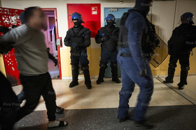 Légende : Dans le cadre de l'operation "Fouilles XXL", des agents de l'administration penitentiere extraient des detenus de la maison d'arret pour hommes de Fleury-Merogis de leur cellule avant de la fouiller. Ces operations sont menees dans tous les centres penitentiers de France a la demande du ministre de l'Intérieur Gerald Darmanin dans le but de lutter contre la presence de telephones portables en prison, mais aussi de stupefiants et de tout autre objet interdit. Le 10/12/2025 /// As part of Operation "XXL Searches," prison officers are removing inmates from their cells at the Fleury-Mérogis men's prison before conducting searches. These operations are being carried out in all French prisons at the request of Interior Minister Gérald Darmanin, with the aim of combating the presence of cell phones, narcotics, and other prohibited items in prisons. On December 10, 2025 /// PHOTO Vincent Boisot