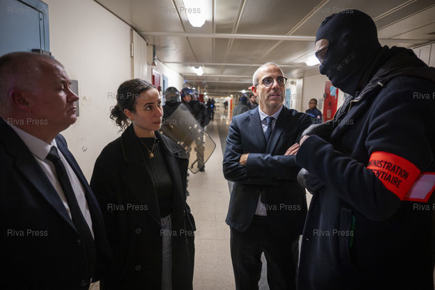 Légende : Gregoire Dulin (procureur de la Republique d'Evry) discute avec un agent de l'administration penitentaire pendant une "Fouille XXL" a la maison d'arret pour hommes de Fleury-Merogis. Ces operations sont menees dans tous les centres penitentiers de France a la demande du ministre de l'Intérieur Gerald Darmanin dans le but de lutter contre la presence de telephones portables en prison, mais aussi de stupefiants et de tout autre objet interdit. Le 10/12/2025 /// Grégoire Dulin (public prosecutor of Évry) speaks with a prison officer during a "major search" at the Fleury-Mérogis men's prison. These operations are being carried out in all French prisons at the request of Interior Minister Gérald Darmanin in order to combat the presence of cell phones in prison, as well as narcotics and other prohibited items. On December 10, 2025 /// PHOTO Vincent Boisot