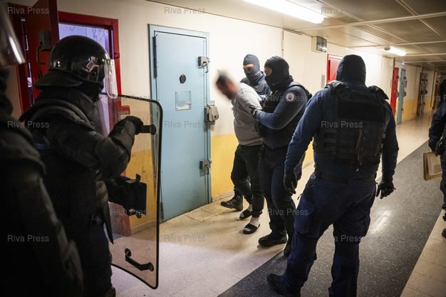 Légende : Dans le cadre de l'operation "Fouilles XXL", des agents de l'administration penitentiere extraient des detenus de la maison d'arret pour hommes de Fleury-Merogis de leur cellule avant de la fouiller. Ces operations sont menees dans tous les centres penitentiers de France a la demande du ministre de l'Intérieur Gerald Darmanin dans le but de lutter contre la presence de telephones portables en prison, mais aussi de stupefiants et de tout autre objet interdit. Le 10/12/2025 /// As part of Operation "XXL Searches," prison officers are removing inmates from their cells at the Fleury-Mérogis men's prison before conducting searches. These operations are being carried out in all French prisons at the request of Interior Minister Gérald Darmanin, with the aim of combating the presence of cell phones, narcotics, and other prohibited items in prisons. On December 10, 2025 /// PHOTO Vincent Boisot