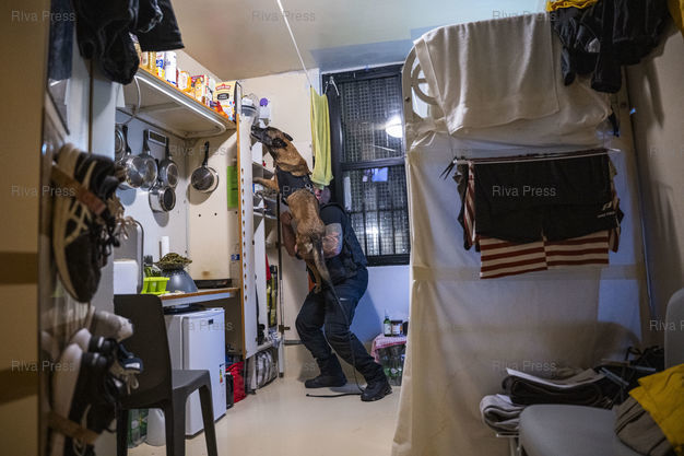 Légende : Dans le cadre de l'operation "Fouilles XXL", des agents de l'unite cynotechnique de l'administration penitentiere et leur chien malinois sont a la recherche de stupefiants dans la cellule de detenus de la maison d'arret pour hommes de Fleury-Merogis. Ces operations sont menees dans tous les centres penitentiers de France a la demande du ministre de l'Intérieur Gerald Darmanin dans le but de lutter contre la presence de telephones portables en prison, mais aussi de stupefiants et de tout autre objet interdit. Le 10/12/2025 /// As part of Operation "XXL Searches," officers from the prison administration's canine unit and their Belgian Malinois are searching for narcotics in a cell at the Fleury-Mérogis men's prison. These operations are being conducted in all French prisons at the request of Interior Minister Gérald Darmanin, with the aim of combating the presence of cell phones in prisons, as well as narcotics and other prohibited items. On December 10, 2025 /// PHOTO Vincent Boisot