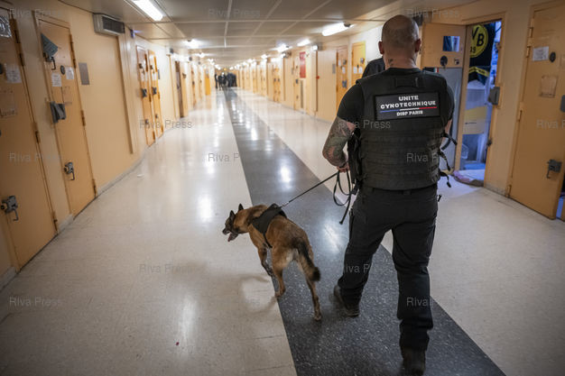 Légende : Dans le cadre de l'operation "Fouilles XXL", des agents de l'unite cynotechnique de l'administration penitentiere et leur chien malinois sont a la recherche de stupefiants dans la cellule de detenus de la maison d'arret pour hommes de Fleury-Merogis. Ces operations sont menees dans tous les centres penitentiers de France a la demande du ministre de l'Intérieur Gerald Darmanin dans le but de lutter contre la presence de telephones portables en prison, mais aussi de stupefiants et de tout autre objet interdit. Le 10/12/2025 /// As part of Operation "XXL Searches," officers from the prison administration's canine unit and their Belgian Malinois are searching for narcotics in a cell at the Fleury-Mérogis men's prison. These operations are being conducted in all French prisons at the request of Interior Minister Gérald Darmanin, with the aim of combating the presence of cell phones in prisons, as well as narcotics and other prohibited items. On December 10, 2025 /// PHOTO Vincent Boisot