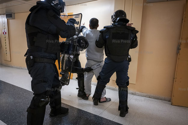 Légende : Dans le cadre de l'operation "Fouilles XXL", des agents de l'administration penitentiere extraient des detenus de la maison d'arret pour hommes de Fleury-Merogis de leur cellule avant de la fouiller. Ces operations sont menees dans tous les centres penitentiers de France a la demande du ministre de l'Intérieur Gerald Darmanin dans le but de lutter contre la presence de telephones portables en prison, mais aussi de stupefiants et de tout autre objet interdit. Le 10/12/2025 /// As part of Operation "XXL Searches," prison officers are removing inmates from their cells at the Fleury-Mérogis men's prison before conducting searches. These operations are being carried out in all French prisons at the request of Interior Minister Gérald Darmanin, with the aim of combating the presence of cell phones, narcotics, and other prohibited items in prisons. On December 10, 2025 /// PHOTO Vincent Boisot