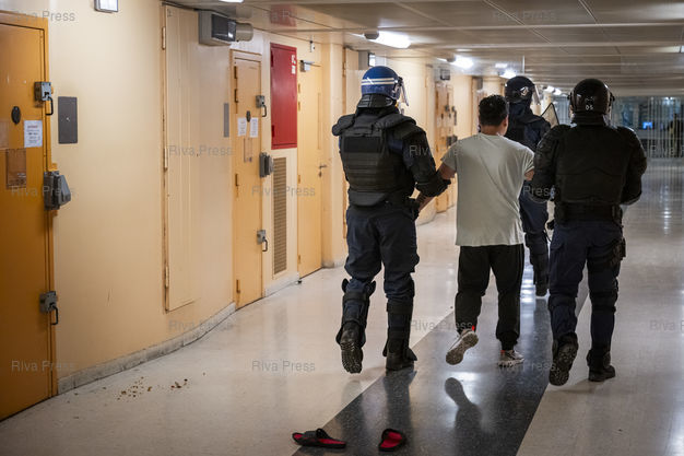 Légende : Dans le cadre de l'operation "Fouilles XXL", des agents de l'administration penitentiere extraient des detenus de la maison d'arret pour hommes de Fleury-Merogis de leur cellule avant de la fouiller. Ces operations sont menees dans tous les centres penitentiers de France a la demande du ministre de l'Intérieur Gerald Darmanin dans le but de lutter contre la presence de telephones portables en prison, mais aussi de stupefiants et de tout autre objet interdit. Le 10/12/2025 /// As part of Operation "XXL Searches," prison officers are removing inmates from their cells at the Fleury-Mérogis men's prison before conducting searches. These operations are being carried out in all French prisons at the request of Interior Minister Gérald Darmanin, with the aim of combating the presence of cell phones, narcotics, and other prohibited items in prisons. On December 10, 2025 /// PHOTO Vincent Boisot