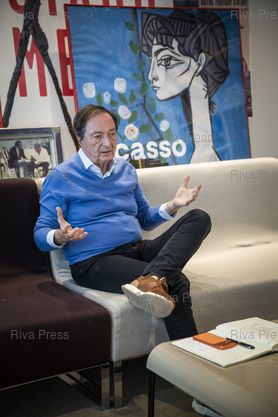 Légende : Michel-Edouard Leclerc, president du comite strategique des centres E. Leclerc, repond aux questions d'une journaliste dans son bureau du siege de la societe a Ivry-sur-Seine. Le 22/12/205 /// Michel-Edouard Leclerc, president of the strategic committee of E. Leclerc stores, answers questions from a journalist in his office at the company headquarters in Ivry-sur-Seine. On December 22, 2025 /// PHOTO VIncent Boisot