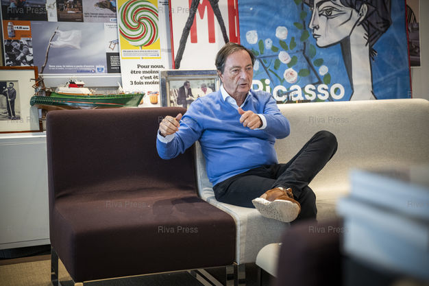 Légende : Michel-Edouard Leclerc, president du comite strategique des centres E. Leclerc, repond aux questions d'une journaliste dans son bureau du siege de la societe a Ivry-sur-Seine. Le 22/12/205 /// Michel-Edouard Leclerc, president of the strategic committee of E. Leclerc stores, answers questions from a journalist in his office at the company headquarters in Ivry-sur-Seine. On December 22, 2025 /// PHOTO VIncent Boisot