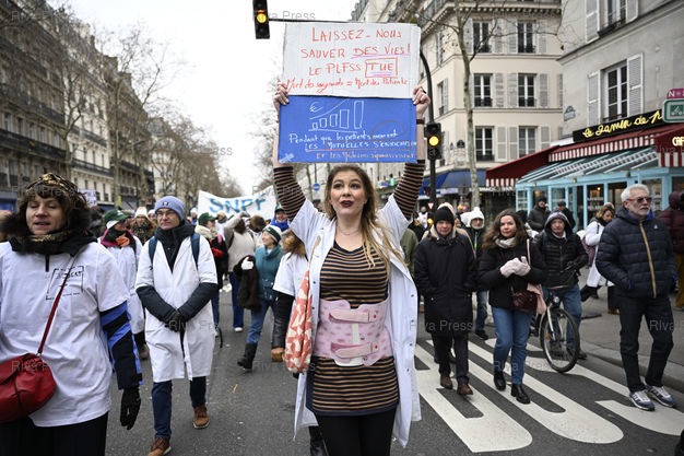 Légende : Manifestation des médecins libéraux, dans le cadre d'une grève du 5 au 15 janvier, contre une "dérive autoritaire" qui menace selon eux leur "liberté d’exercice" /// Demonstration by private practice doctors, as part of a strike from January 5th to 15th, against an "authoritarian drift" which they say threatens their "freedom to practice" - Paris - 10/01/2026 - Photo © Lionel Préau +33 (0)6 68 12 83 77
