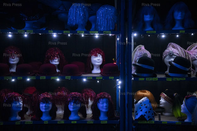 Légende : Des chapeaux et perruques dans les coulisses d'Holiday on Ice pour les changements de tenue des patineurs. Dans le cadre de sa tournee europeenne 2025/2026, la troupe d'Holiday on Ice joue son spectacle "Horizons" sur le theme "Ecoute les battements de la ville !" dans la ville de Breda aux Pays-Bas. Le 12/12/2025 /// Hats and wigs backstage at Holiday on Ice for the skaters' costume changes. As part of its 2025/2026 European tour, the Holiday on Ice troupe is performing its show "Horizons" with the theme "Feel the City Beat" in the city of Breda, Netherlands. On December 12, 2025 /// PHOTO Vincent Boisot