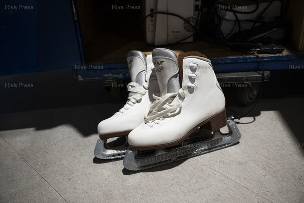 Légende : Des patins à glace dans les coulisses du spectacle Holiday on Ice. Dans le cadre de sa tournee europeenne 2025/2026, la troupe d'Holiday on Ice joue son spectacle "Horizons" sur le theme "Ecoute les battements de la ville !" dans la ville de Breda aux Pays-Bas. Le 12/12/2025 /// Ice skates backstage at the Holiday on Ice show. As part of its 2025/2026 European tour, the Holiday on Ice troupe is performing its show "Horizons" with the theme "Feel the City Beat" in the city of Breda in the Netherlands. On December 12, 2025 /// PHOTO Vincent Boisot