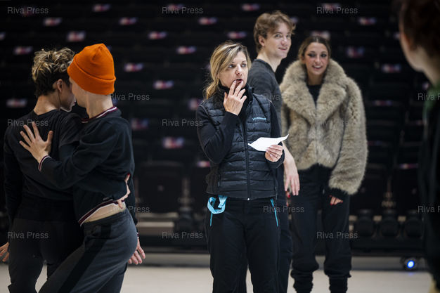 Légende : Des patineurs d'Holiday on Ice repetent sur la glace avec la superviseuse du spectacle Katarina Gravendeel. Dans le cadre de sa tournee europeenne 2025/2026, la troupe d'Holiday on Ice joue son spectacle "Horizons" sur le theme "Ecoute les battements de la ville !" dans la ville de Breda aux Pays-Bas. Le 12/12/2025 /// Skaters from Holiday on Ice rehearse on the ice with the show's supervisor Katarina Gravendeel. As part of its 2025/2026 European tour, the Holiday on Ice troupe is performing its show "Horizons" with the theme"Feel the City Beat" in the city of Breda, Netherlands. On December 12, 2025 /// PHOTO Vincent Boisot