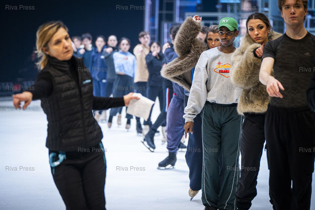 Légende : Des patineurs d'Holiday on Ice repetent sur la glace avec la superviseuse du spectacle Katarina Gravendeel. Dans le cadre de sa tournee europeenne 2025/2026, la troupe d'Holiday on Ice joue son spectacle "Horizons" sur le theme "Ecoute les battements de la ville !" dans la ville de Breda aux Pays-Bas. Le 12/12/2025 /// Skaters from Holiday on Ice rehearse on the ice with the show's supervisor Katarina Gravendeel. As part of its 2025/2026 European tour, the Holiday on Ice troupe is performing its show "Horizons" with the theme"Feel the City Beat" in the city of Breda, Netherlands. On December 12, 2025 /// PHOTO Vincent Boisot