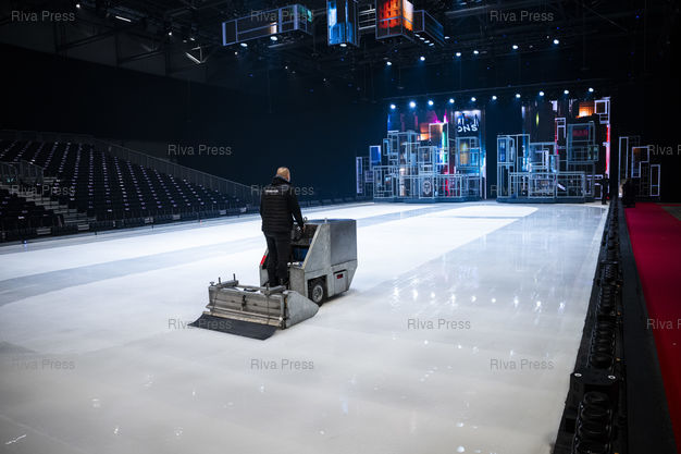 Légende : Un technicien lisse la surface de la patinoire d'Holiday on Ice plusieurs fois par jour. Dans le cadre de sa tournee europeenne 2025/2026, la troupe d'Holiday on Ice joue son spectacle "Horizons" sur le theme "Ecoute les battements de la ville !" dans la ville de Breda aux Pays-Bas. Le 12/12/2025 /// A technician smooths the surface of the Holiday on Ice rink several times a day. As part of its 2025/2026 European tour, the Holiday on Ice troupe is performing its show "Horizons" with the theme "Listen to the heartbeat of the city!" in the city of Breda in the Netherlands. On December 12, 2025 /// PHOTO Vincent Boisot