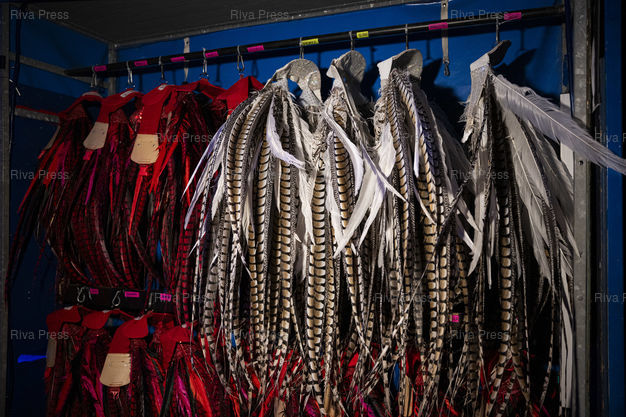 Légende : Des costumes et des elements de decor sont stockes dans les coulisses d'Holiday on Ice. Dans le cadre de sa tournee europeenne 2025/2026, la troupe d'Holiday on Ice joue son spectacle "Horizons" sur le theme "Ecoute les battements de la ville !" dans la ville de Breda aux Pays-Bas. Le 12/12/2025 /// Costumes and set pieces are stored backstage at Holiday on Ice. As part of its 2025/2026 European tour, the Holiday on Ice troupe is performing its show "Horizons" with the theme "Feel the City Beat!" in the city of Breda, Netherlands. On December 12, 2025 /// PHOTO Vincent Boisot