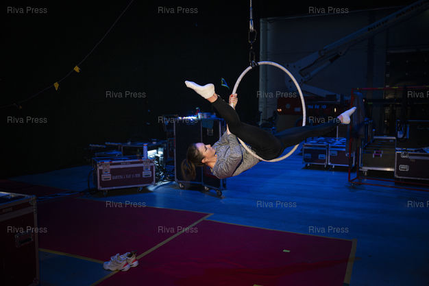 Légende : Une acrobate d'Holiday on Ice s'entraine en coulisse entre deux spectacles. Dans le cadre de sa tournee europeenne 2025/2026, la troupe d'Holiday on Ice joue son spectacle "Horizons" sur le theme "Ecoute les battements de la ville !" dans la ville de Breda aux Pays-Bas. Le 12/12/2025 /// A Holiday on Ice acrobat trains backstage between shows. As part of its 2025/2026 European tour, the Holiday on Ice troupe is performing its show "Horizons" with the theme "Feel the City Beat!" in the city of Breda, Netherlands. On December 12, 2025 /// PHOTO Vincent Boisot
