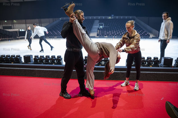Légende : Les patineurs russes Ekaterina Borisova et Alexey Rogonov donnent des conseils a la patineuse franco-canadien Elizabeth Thibodeau Mailhot pendant une repetition entre deux spectacles d'Holiday on Ice. Dans le cadre de sa tournee europeenne 2025/2026, la troupe d'Holiday on Ice joue son spectacle "Horizons" sur le theme "Ecoute les battements de la ville !" dans la ville de Breda aux Pays-Bas. Le 12/12/2025 /// Russian skaters Ekaterina Borisova and Alexey Rogonov give advice to French-Canadian skater Elizabeth Thibodeau Mailhot during a rehearsal between two Holiday on Ice shows. As part of its 2025/2026 European tour, the Holiday on Ice troupe is performing its show "Horizons" with the theme "Feel the City Beat!" in the city of Breda, Netherlands. On December 12, 2025 /// PHOTO Vincent Boisot