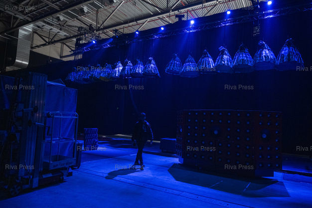 Légende : Des costumes sont accroches en hauteur derriere le rideau de scene d'Holiday on Ice. Dans le cadre de sa tournee europeenne 2025/2026, la troupe d'Holiday on Ice joue son spectacle "Horizons" sur le theme "Ecoute les battements de la ville !" dans la ville de Breda aux Pays-Bas. Le 12/12/2025 /// Costumes are hung high behind the stage curtain of Holiday on Ice. As part of its 2025/2026 European tour, the Holiday on Ice troupe is performing its show "Horizons" with the theme "Feel the City Beat" in the city of Breda in the Netherlands. On December 12, 2025 /// PHOTO Vincent Boisot