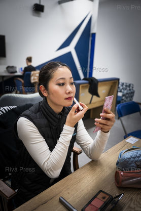 Légende : Une patineuse se prepare dans la loge des "patineuses principales" avant un spectacle d'Holiday on Ice. Dans le cadre de sa tournee europeenne 2025/2026, la troupe d'Holiday on Ice joue son spectacle "Horizons" sur le theme "Ecoute les battements de la ville !" dans la ville de Breda aux Pays-Bas. Le 12/12/2025 /// A figure skater prepares in the "principal skaters'" dressing room before a Holiday on Ice show. As part of its 2025/2026 European tour, the Holiday on Ice troupe is performing its show "Horizons" with the theme "Feel the City Beat!" in the city of Breda, Netherlands. On December 12, 2025 /// PHOTO Vincent Boisot