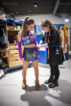 Légende : Une costumiere retouche la tenue de la patineuse franco-canadienne Elizabeth Thibodeau Mailhot avant un spectacle d'Holiday on Ice. Dans le cadre de sa tournee europeenne 2025/2026, la troupe d'Holiday on Ice joue son spectacle "Horizons" sur le theme "Ecoute les battements de la ville !" dans la ville de Breda aux Pays-Bas. Le 12/12/2025 /// A costume designer alters the outfit of French-Canadian figure skater Elizabeth Thibodeau Mailhot before a Holiday on Ice show. As part of its 2025/2026 European tour, the Holiday on Ice troupe is performing its show "Horizons" with the theme "Feel the City Beat!" in the city of Breda, Netherlands. On December 12, 2025 /// PHOTO Vincent Boisot