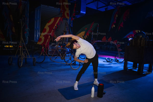 Légende : Le patineur canadien Matthew Markell s'echauffe dans le coulisses avant un spectalce d'Holiday on Ice. Dans le cadre de sa tournee europeenne 2025/2026, la troupe d'Holiday on Ice joue son spectacle "Horizons" sur le theme "Ecoute les battements de la ville !" dans la ville de Breda aux Pays-Bas. Le 12/12/2025 /// Canadian figure skater Matthew Markell warms up backstage before a Holiday on Ice show. As part of its 2025/2026 European tour, the Holiday on Ice troupe is performing its show "Horizons" with the theme "Feel the City Beat!" in the city of Breda, Netherlands. On December 12, 2025 /// PHOTO Vincent Boisot