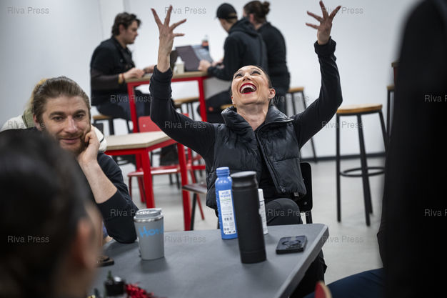 Légende : Les "patineurs principaux" d'Holiday on Ice (dont la canadienne Robin Johnstone et le russe Alexey Rogonov) sont en reunion avec la superviseuse du spectacle Katarina Gravendeel avant de rentrer sur la glace pour le spectacle du soir. Dans le cadre de sa tournee europeenne 2025/2026, la troupe d'Holiday on Ice joue son spectacle "Horizons" sur le theme "Ecoute les battements de la ville !" dans la ville de Breda aux Pays-Bas. Le 12/12/2025 /// The "principal skaters" of Holiday on Ice (including Canadian Robin Johnstone and Russian Alexey Rogonov) are in a meeting with the show supervisor Katarina Gravendeel before returning to the ice for the evening show. As part of its 2025/2026 European tour, the Holiday on Ice troupe is performing its show "Horizons" with the theme "Feel the City Beat!" in the city of Breda, Netherlands. On December 12, 2025 /// PHOTO Vincent Boisot