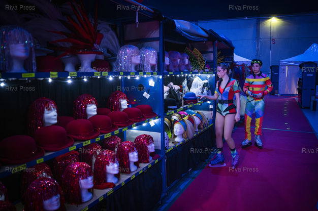 Légende : Des chapeaux et perruques dans les coulisses d'Holiday on Ice pour les changements de tenue des patineurs. Dans le cadre de sa tournee europeenne 2025/2026, la troupe d'Holiday on Ice joue son spectacle "Horizons" sur le theme "Ecoute les battements de la ville !" dans la ville de Breda aux Pays-Bas. Le 12/12/2025 /// Hats and wigs backstage at Holiday on Ice for the skaters' costume changes. As part of its 2025/2026 European tour, the Holiday on Ice troupe is performing its show "Horizons" with the theme "Feel the City Beat" in the city of Breda, Netherlands. On December 12, 2025 /// PHOTO Vincent Boisot