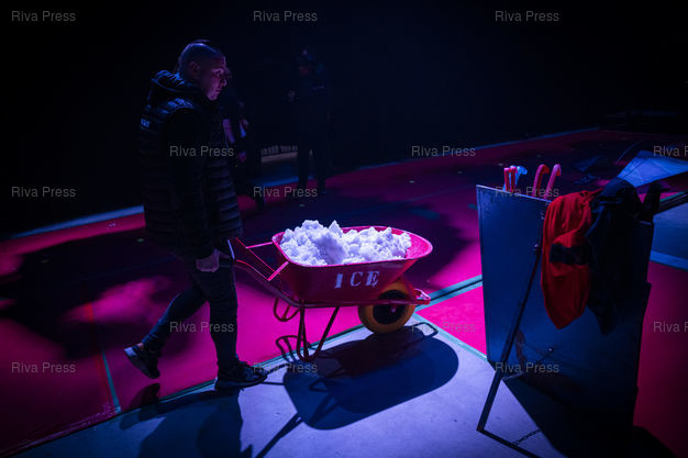 Légende : Un technicien lisse la surface de la patinoire d'Holiday on Ice plusieurs fois par jour. Dans le cadre de sa tournee europeenne 2025/2026, la troupe d'Holiday on Ice joue son spectacle "Horizons" sur le theme "Ecoute les battements de la ville !" dans la ville de Breda aux Pays-Bas. Le 12/12/2025 /// A technician smooths the surface of the Holiday on Ice rink several times a day. As part of its 2025/2026 European tour, the Holiday on Ice troupe is performing its show "Horizons" with the theme "Listen to the heartbeat of the city!" in the city of Breda in the Netherlands. On December 12, 2025 /// PHOTO Vincent Boisot