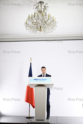 Légende : Jordan Bardella, président du Rassemblement National et député européen, présente ses vœux à la presse /// Jordan Bardella, president of the Rassemblement National party, and MEP, presents his New Year's wishes to the press - Paris - 12/01/2026 - Photo © Lionel Préau +33 (0)6 68 12 83 77