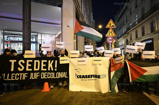 Légende : Rassemblement pour dénoncer l'emprise et les violences faites aux femmes dans le cinéma à proximité de l'Olympia où se déroule la Cérémonie des César, grande soirée du cinéma français. Tsedek (justice en hébreu), collectif de « juifs décoloniaux » qui dénonce le « racisme d'État » en France et « l'apartheid » en Palestine /// Rally to denounce the influence and violence against women in the cinema near the Olympia where the César Ceremony takes place, a great evening of French cinema. Tsedek (justice in Hebrew), collective of “decolonial Jewsî which denounces “state racismî in France and “apartheidî in Palestine - Paris - 23/02/2024 - Photo © Lionel Préau +33 (0)6 68 12 83 77
