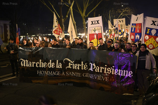 Légende : Défilé aux flambeaux de militants de Paris Fierté, émanation du groupuscule d'extrême droite dissous Génération identitaire, en hommage à Sainte-Geneviève, patronne de Paris qui aurait repoussé les Huns en 451, figure utilisée pour défendre l'identité face à une immigration massive /// Torchlight procession by activists from Paris Fierté, an offshoot of the dissolved far-right group Génération Identitaire, in homage to Saint Genevieve, patron saint of Paris who is said to have repelled the Huns in 451, a figure used to defend identity in the face of mass immigration - Paris - 17/01/2026 - Photo © Lionel Préau +33 (0)6 68 12 83 77