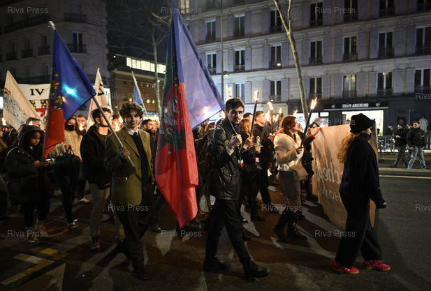 Légende : Défilé aux flambeaux de militants de Paris Fierté, émanation du groupuscule d'extrême droite dissous Génération identitaire, en hommage à Sainte-Geneviève, patronne de Paris qui aurait repoussé les Huns en 451, figure utilisée pour défendre l'identité face à une immigration massive /// Torchlight procession by activists from Paris Fierté, an offshoot of the dissolved far-right group Génération Identitaire, in homage to Saint Genevieve, patron saint of Paris who is said to have repelled the Huns in 451, a figure used to defend identity in the face of mass immigration - Paris - 17/01/2026 - Photo © Lionel Préau +33 (0)6 68 12 83 77