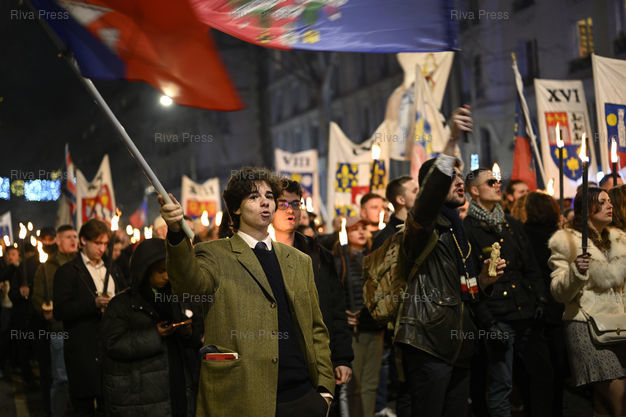 Légende : Défilé aux flambeaux de militants de Paris Fierté, émanation du groupuscule d'extrême droite dissous Génération identitaire, en hommage à Sainte-Geneviève, patronne de Paris qui aurait repoussé les Huns en 451, figure utilisée pour défendre l'identité face à une immigration massive /// Torchlight procession by activists from Paris Fierté, an offshoot of the dissolved far-right group Génération Identitaire, in homage to Saint Genevieve, patron saint of Paris who is said to have repelled the Huns in 451, a figure used to defend identity in the face of mass immigration - Paris - 17/01/2026 - Photo © Lionel Préau +33 (0)6 68 12 83 77