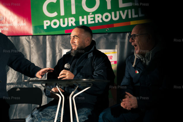 Légende : Le rappeur havrais Medine au meeting de Vincent Louvet, candidat (Rassemblement citoyen) aux elections municipales d'Herouville-Saint-Clair (Calvados) les 15 et 22 mars 2026, face au maire sortant Rodolphe Thomas (Modem). Le rappeur etait invite en soutien au candidat de gauche, et a tenu un showcase (mini concert gratuit). Le Rassemblement National de la Jeunesse du Calvados a reclame l'annulation de la venue de Medine, souvent pris pour cible par l'extreme droite pour ses pretendues attaques à la laîcité ou des textes jugés « radicaux ». 17 janvier 2026, Herouville-Saint-Clair. Teo Manisier / Riva Press /// The rapper Medine from Le Havre at the rally of Vincent Louvet, candidate (Rassemblement citoyen) in the municipal elections in Herouville-Saint-Clair (Calvados) on March 15 and 22, 2026, against the outgoing mayor Rodolphe Thomas (Modem). The rapper was invited to support the left-wing candidate and held a showcase (free mini-concert). The Calvados National Youth Rally called for the cancellation of Medine's appearance, as he is often targeted by the far right for his alleged attacks on secularism and lyrics deemed "radical." January 17, 2026, Herouville-Saint-Clair. Teo Manisier / Riva Press