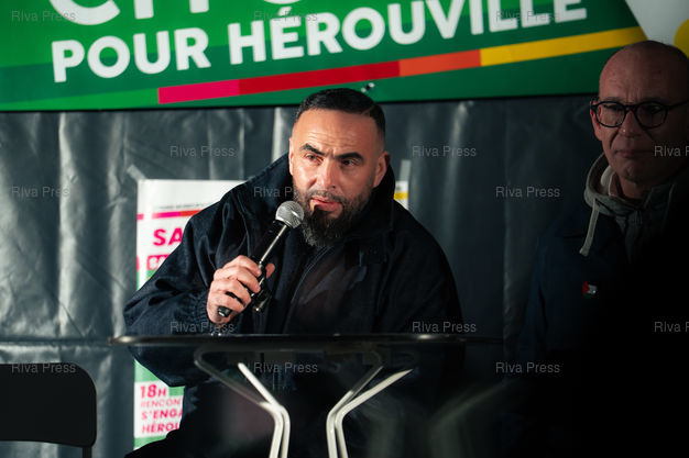 Légende : Le rappeur havrais Medine au meeting de Vincent Louvet, candidat (Rassemblement citoyen) aux elections municipales d'Herouville-Saint-Clair (Calvados) les 15 et 22 mars 2026, face au maire sortant Rodolphe Thomas (Modem). Le rappeur etait invite en soutien au candidat de gauche, et a tenu un showcase (mini concert gratuit). Le Rassemblement National de la Jeunesse du Calvados a reclame l'annulation de la venue de Medine, souvent pris pour cible par l'extreme droite pour ses pretendues attaques à la laîcité ou des textes jugés « radicaux ». 17 janvier 2026, Herouville-Saint-Clair. Teo Manisier / Riva Press /// The rapper Medine from Le Havre at the rally of Vincent Louvet, candidate (Rassemblement citoyen) in the municipal elections in Herouville-Saint-Clair (Calvados) on March 15 and 22, 2026, against the outgoing mayor Rodolphe Thomas (Modem). The rapper was invited to support the left-wing candidate and held a showcase (free mini-concert). The Calvados National Youth Rally called for the cancellation of Medine's appearance, as he is often targeted by the far right for his alleged attacks on secularism and lyrics deemed "radical." January 17, 2026, Herouville-Saint-Clair. Teo Manisier / Riva Press