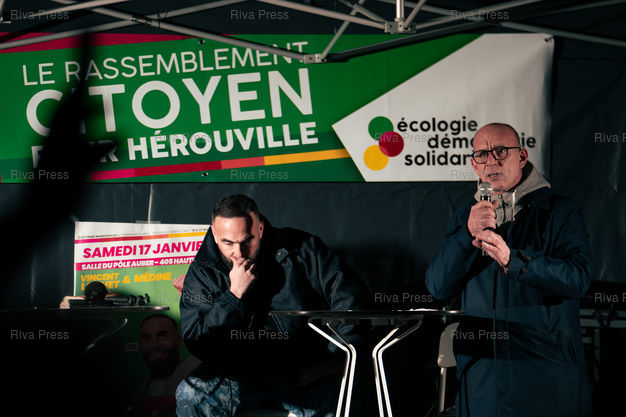 Légende : Le rappeur havrais Medine au meeting de Vincent Louvet, candidat (Rassemblement citoyen) aux elections municipales d'Herouville-Saint-Clair (Calvados) les 15 et 22 mars 2026, face au maire sortant Rodolphe Thomas (Modem). Le rappeur etait invite en soutien au candidat de gauche, et a tenu un showcase (mini concert gratuit). Le Rassemblement National de la Jeunesse du Calvados a reclame l'annulation de la venue de Medine, souvent pris pour cible par l'extreme droite pour ses pretendues attaques à la laîcité ou des textes jugés « radicaux ». 17 janvier 2026, Herouville-Saint-Clair. Teo Manisier / Riva Press /// The rapper Medine from Le Havre at the rally of Vincent Louvet, candidate (Rassemblement citoyen) in the municipal elections in Herouville-Saint-Clair (Calvados) on March 15 and 22, 2026, against the outgoing mayor Rodolphe Thomas (Modem). The rapper was invited to support the left-wing candidate and held a showcase (free mini-concert). The Calvados National Youth Rally called for the cancellation of Medine's appearance, as he is often targeted by the far right for his alleged attacks on secularism and lyrics deemed "radical." January 17, 2026, Herouville-Saint-Clair. Teo Manisier / Riva Press