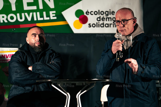 Légende : Vincent Louvet, candidat (Rassemblement citoyen) aux elections municipales d'Herouville-Saint-Clair (Calvados) les 15 et 22 mars 2026, face au maire sortant Rodolphe Thomas (Modem), pendant son meeting aux cotes du rappeur havrais Medine. Le rappeur etait invite en soutien au candidat de gauche, et a tenu un showcase (mini concert gratuit). Le Rassemblement National de la Jeunesse du Calvados a reclame l'annulation de la venue de Medine, souvent pris pour cible par l'extreme droite pour ses pretendues attaques à la laîcité ou des textes jugés « radicaux ». 17 janvier 2026, Herouville-Saint-Clair. Teo Manisier / Riva Press /// Vincent Louvet, candidate (Rassemblement citoyen) in the municipal elections in Herouville-Saint-Clair (Calvados) on March 15 and 22, 2026, facing incumbent mayor Rodolphe Thomas (Modem), during his rally alongside Le Havre rapper Medine. The rapper was invited to support the left-wing candidate and held a showcase (free mini-concert). The Calvados National Youth Rally called for the cancellation of Medine's appearance, as he is often targeted by the far right for his alleged attacks on secularism and lyrics deemed "radical." January 17, 2026, Herouville-Saint-Clair. Teo Manisier / Riva Press ///