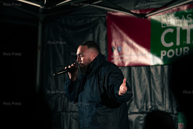 Légende : Le rappeur havrais Medine au meeting de Vincent Louvet, candidat (Rassemblement citoyen) aux elections municipales d'Herouville-Saint-Clair (Calvados) les 15 et 22 mars 2026, face au maire sortant Rodolphe Thomas (Modem). Le rappeur etait invite en soutien au candidat de gauche, et a tenu un showcase (mini concert gratuit). Le Rassemblement National de la Jeunesse du Calvados a reclame l'annulation de la venue de Medine, souvent pris pour cible par l'extreme droite pour ses pretendues attaques à la laîcité ou des textes jugés « radicaux ». 17 janvier 2026, Herouville-Saint-Clair. Teo Manisier / Riva Press /// The rapper Medine from Le Havre at the rally of Vincent Louvet, candidate (Rassemblement citoyen) in the municipal elections in Herouville-Saint-Clair (Calvados) on March 15 and 22, 2026, against the outgoing mayor Rodolphe Thomas (Modem). The rapper was invited to support the left-wing candidate and held a showcase (free mini-concert). The Calvados National Youth Rally called for the cancellation of Medine's appearance, as he is often targeted by the far right for his alleged attacks on secularism and lyrics deemed "radical." January 17, 2026, Herouville-Saint-Clair. Teo Manisier / Riva Press
