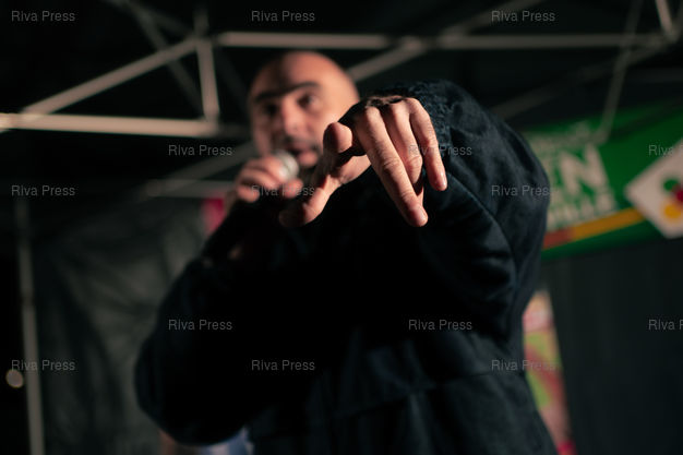 Légende : Le rappeur havrais Medine au meeting de Vincent Louvet, candidat (Rassemblement citoyen) aux elections municipales d'Herouville-Saint-Clair (Calvados) les 15 et 22 mars 2026, face au maire sortant Rodolphe Thomas (Modem). Le rappeur etait invite en soutien au candidat de gauche, et a tenu un showcase (mini concert gratuit). Le Rassemblement National de la Jeunesse du Calvados a reclame l'annulation de la venue de Medine, souvent pris pour cible par l'extreme droite pour ses pretendues attaques à la laîcité ou des textes jugés « radicaux ». 17 janvier 2026, Herouville-Saint-Clair. Teo Manisier / Riva Press /// The rapper Medine from Le Havre at the rally of Vincent Louvet, candidate (Rassemblement citoyen) in the municipal elections in Herouville-Saint-Clair (Calvados) on March 15 and 22, 2026, against the outgoing mayor Rodolphe Thomas (Modem). The rapper was invited to support the left-wing candidate and held a showcase (free mini-concert). The Calvados National Youth Rally called for the cancellation of Medine's appearance, as he is often targeted by the far right for his alleged attacks on secularism and lyrics deemed "radical." January 17, 2026, Herouville-Saint-Clair. Teo Manisier / Riva Press