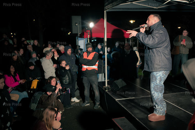 Légende : Le rappeur havrais Medine au meeting de Vincent Louvet, candidat (Rassemblement citoyen) aux elections municipales d'Herouville-Saint-Clair (Calvados) les 15 et 22 mars 2026, face au maire sortant Rodolphe Thomas (Modem). Le rappeur etait invite en soutien au candidat de gauche, et a tenu un showcase (mini concert gratuit). Le Rassemblement National de la Jeunesse du Calvados a reclame l'annulation de la venue de Medine, souvent pris pour cible par l'extreme droite pour ses pretendues attaques à la laîcité ou des textes jugés « radicaux ». 17 janvier 2026, Herouville-Saint-Clair. Teo Manisier / Riva Press /// The rapper Medine from Le Havre at the rally of Vincent Louvet, candidate (Rassemblement citoyen) in the municipal elections in Herouville-Saint-Clair (Calvados) on March 15 and 22, 2026, against the outgoing mayor Rodolphe Thomas (Modem). The rapper was invited to support the left-wing candidate and held a showcase (free mini-concert). The Calvados National Youth Rally called for the cancellation of Medine's appearance, as he is often targeted by the far right for his alleged attacks on secularism and lyrics deemed "radical." January 17, 2026, Herouville-Saint-Clair. Teo Manisier / Riva Press