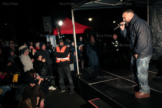 Légende : Le rappeur havrais Medine au meeting de Vincent Louvet, candidat (Rassemblement citoyen) aux elections municipales d'Herouville-Saint-Clair (Calvados) les 15 et 22 mars 2026, face au maire sortant Rodolphe Thomas (Modem). Le rappeur etait invite en soutien au candidat de gauche, et a tenu un showcase (mini concert gratuit). Le Rassemblement National de la Jeunesse du Calvados a reclame l'annulation de la venue de Medine, souvent pris pour cible par l'extreme droite pour ses pretendues attaques à la laîcité ou des textes jugés « radicaux ». 17 janvier 2026, Herouville-Saint-Clair. Teo Manisier / Riva Press /// The rapper Medine from Le Havre at the rally of Vincent Louvet, candidate (Rassemblement citoyen) in the municipal elections in Herouville-Saint-Clair (Calvados) on March 15 and 22, 2026, against the outgoing mayor Rodolphe Thomas (Modem). The rapper was invited to support the left-wing candidate and held a showcase (free mini-concert). The Calvados National Youth Rally called for the cancellation of Medine's appearance, as he is often targeted by the far right for his alleged attacks on secularism and lyrics deemed "radical." January 17, 2026, Herouville-Saint-Clair. Teo Manisier / Riva Press