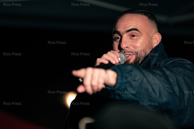 Légende : Le rappeur havrais Medine au meeting de Vincent Louvet, candidat (Rassemblement citoyen) aux elections municipales d'Herouville-Saint-Clair (Calvados) les 15 et 22 mars 2026, face au maire sortant Rodolphe Thomas (Modem). Le rappeur etait invite en soutien au candidat de gauche, et a tenu un showcase (mini concert gratuit). Le Rassemblement National de la Jeunesse du Calvados a reclame l'annulation de la venue de Medine, souvent pris pour cible par l'extreme droite pour ses pretendues attaques à la laîcité ou des textes jugés « radicaux ». 17 janvier 2026, Herouville-Saint-Clair. Teo Manisier / Riva Press /// The rapper Medine from Le Havre at the rally of Vincent Louvet, candidate (Rassemblement citoyen) in the municipal elections in Herouville-Saint-Clair (Calvados) on March 15 and 22, 2026, against the outgoing mayor Rodolphe Thomas (Modem). The rapper was invited to support the left-wing candidate and held a showcase (free mini-concert). The Calvados National Youth Rally called for the cancellation of Medine's appearance, as he is often targeted by the far right for his alleged attacks on secularism and lyrics deemed "radical." January 17, 2026, Herouville-Saint-Clair. Teo Manisier / Riva Press