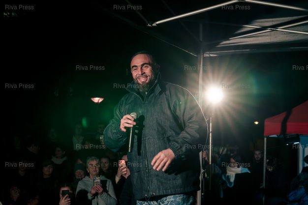Légende : Le rappeur havrais Medine au meeting de Vincent Louvet, candidat (Rassemblement citoyen) aux elections municipales d'Herouville-Saint-Clair (Calvados) les 15 et 22 mars 2026, face au maire sortant Rodolphe Thomas (Modem). Le rappeur etait invite en soutien au candidat de gauche, et a tenu un showcase (mini concert gratuit). Le Rassemblement National de la Jeunesse du Calvados a reclame l'annulation de la venue de Medine, souvent pris pour cible par l'extreme droite pour ses pretendues attaques à la laîcité ou des textes jugés « radicaux ». 17 janvier 2026, Herouville-Saint-Clair. Teo Manisier / Riva Press /// The rapper Medine from Le Havre at the rally of Vincent Louvet, candidate (Rassemblement citoyen) in the municipal elections in Herouville-Saint-Clair (Calvados) on March 15 and 22, 2026, against the outgoing mayor Rodolphe Thomas (Modem). The rapper was invited to support the left-wing candidate and held a showcase (free mini-concert). The Calvados National Youth Rally called for the cancellation of Medine's appearance, as he is often targeted by the far right for his alleged attacks on secularism and lyrics deemed "radical." January 17, 2026, Herouville-Saint-Clair. Teo Manisier / Riva Press