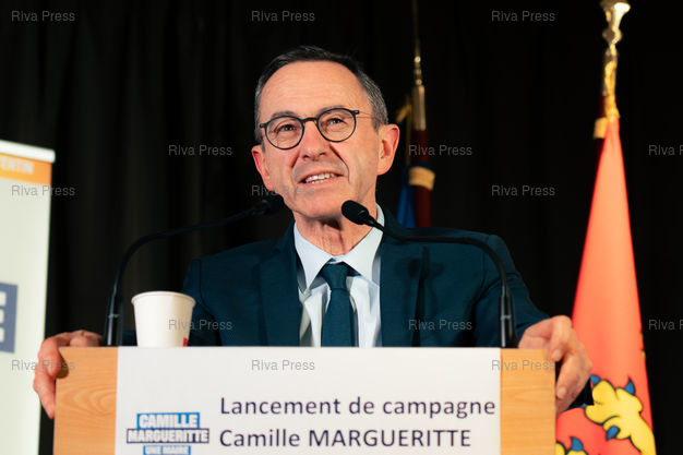 Légende : L'ancien ministre de l'Interieur, senateur (LR) et president des Republicains Bruno Retailleau au lancement de la campagne de Camille Margueritte, candidate d'opposition (LR) a la mairie de Cherbourg-en-Cotentin (Manche) contre le maire socialiste sortant Benoit Arrive, le 23 janvier 2026 a la salle Montecot a Cherbourg, pour les elections municipales des 15 et 22 mars 2026. Cherbourg-en-Cotentin, 23 janvier 2026. Teo Manisier / Riva Press /// Former Minister of the Interior, Senator (LR) and President of Les Républicains Bruno Retailleau at the launch of Camille Margueritte's campaign, opposition candidate (Republicans) for mayor of Cherbourg-en-Cotentin (Manche) against outgoing socialist mayor Benoit Arrive, on January 23, 2026, at the Salle Montecot in Cherbourg, for the municipal elections on March 15 and 22, 2026. Cherbourg-en-Cotentin, January 23, 2026. Teo Manisier / Riva Press