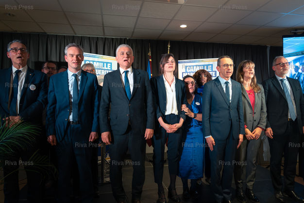 Légende : L'ancien ministre de l'Interieur, senateur (LR) et president des Republicains Bruno Retailleau, l'ancien ministre des armees et president de la region Normandie Herve Morin, le senateur (LR) David Margueritte et la candidate (LR) d'opposition Camille Margueritte au lancement de sa campagne pour la mairie de Cherbourg-en-Cotentin (Manche) contre le maire socialiste sortant Benoit Arrive, le 23 janvier 2026 a la salle Montecot a Cherbourg, pour les elections municipales des 15 et 22 mars 2026. Cherbourg-en-Cotentin, 23 janvier 2026. Teo Manisier / Riva Press /// Former Minister of the Interior, Senator (LR) and President of Les Républicains Bruno Retailleau, former Minister of the Armed Forces and President of the Normandy Region Hervé Morin, Senator (LR) David Margueritte, and opposition candidate Camille Margueritte (LR) at the launch of her campaign for mayor of Cherbourg-en-Cotentin (Manche) against incumbent socialist mayor Benoit Arrive on January 23, 2026, at the Salle Montecot in Cherbourg, ahead of the municipal elections on March 15 and 22, 2026. Cherbourg-en-Cotentin, January 23, 2026. Teo Manisier / Riva Press