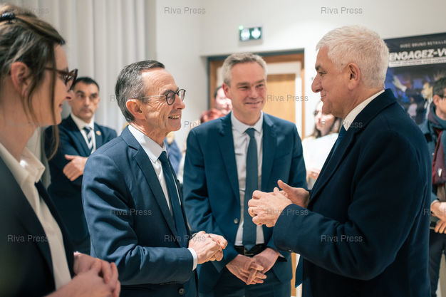 Légende : L'ancien ministre de l'Interieur, senateur (LR) et president des Republicains Bruno Retailleau, l'ancien ministre des armees et president de la region Normandie Herve Morin, le senateur (LR) David Margueritte et la candidate (LR) d'opposition Camille Margueritte au lancement de sa campagne pour la mairie de Cherbourg-en-Cotentin (Manche) contre le maire socialiste sortant Benoit Arrive, le 23 janvier 2026 a la salle Montecot a Cherbourg, pour les elections municipales des 15 et 22 mars 2026. Cherbourg-en-Cotentin, 23 janvier 2026. Teo Manisier / Riva Press /// Former Minister of the Interior, Senator (LR) and President of Les Républicains Bruno Retailleau, former Minister of the Armed Forces and President of the Normandy Region Hervé Morin, Senator (LR) David Margueritte, and opposition candidate Camille Margueritte (LR) at the launch of her campaign for mayor of Cherbourg-en-Cotentin (Manche) against incumbent socialist mayor Benoit Arrive on January 23, 2026, at the Salle Montecot in Cherbourg, ahead of the municipal elections on March 15 and 22, 2026. Cherbourg-en-Cotentin, January 23, 2026. Teo Manisier / Riva Press