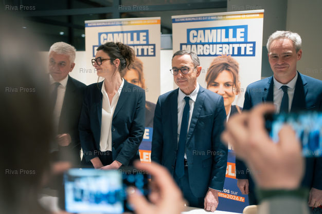 Légende : L'ancien ministre de l'Interieur, senateur (LR) et president des Republicains Bruno Retailleau, l'ancien ministre des armees et president de la region Normandie Herve Morin, le senateur (LR) David Margueritte et la candidate (LR) d'opposition Camille Margueritte au lancement de sa campagne pour la mairie de Cherbourg-en-Cotentin (Manche) contre le maire socialiste sortant Benoit Arrive, le 23 janvier 2026 a la salle Montecot a Cherbourg, pour les elections municipales des 15 et 22 mars 2026. Cherbourg-en-Cotentin, 23 janvier 2026. Teo Manisier / Riva Press /// Former Minister of the Interior, Senator (LR) and President of Les Républicains Bruno Retailleau, former Minister of the Armed Forces and President of the Normandy Region Hervé Morin, Senator (LR) David Margueritte, and opposition candidate Camille Margueritte (LR) at the launch of her campaign for mayor of Cherbourg-en-Cotentin (Manche) against incumbent socialist mayor Benoit Arrive on January 23, 2026, at the Salle Montecot in Cherbourg, ahead of the municipal elections on March 15 and 22, 2026. Cherbourg-en-Cotentin, January 23, 2026. Teo Manisier / Riva Press